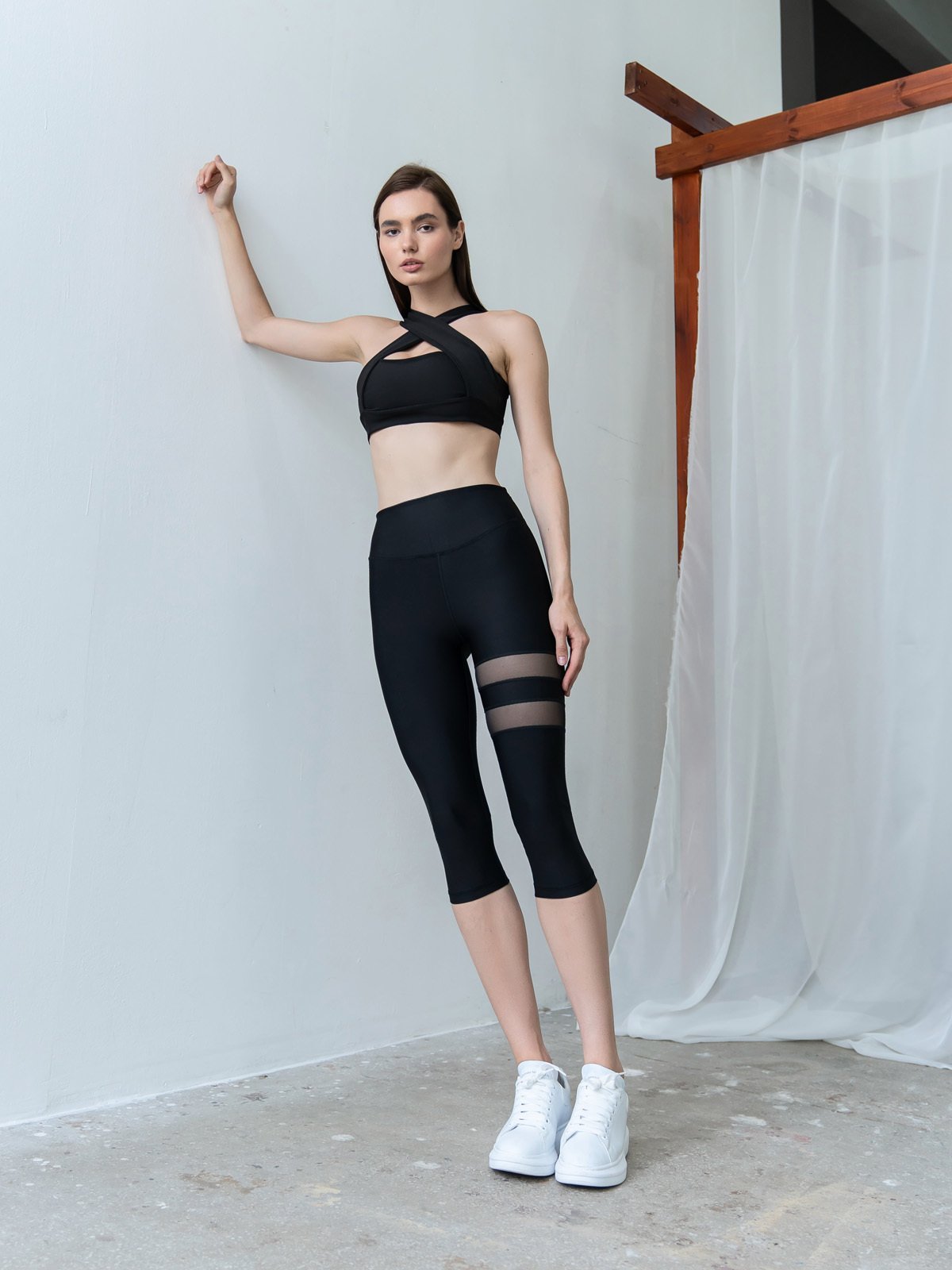 Siyah Renk Tül Detaylı Kapri Spor Tayt