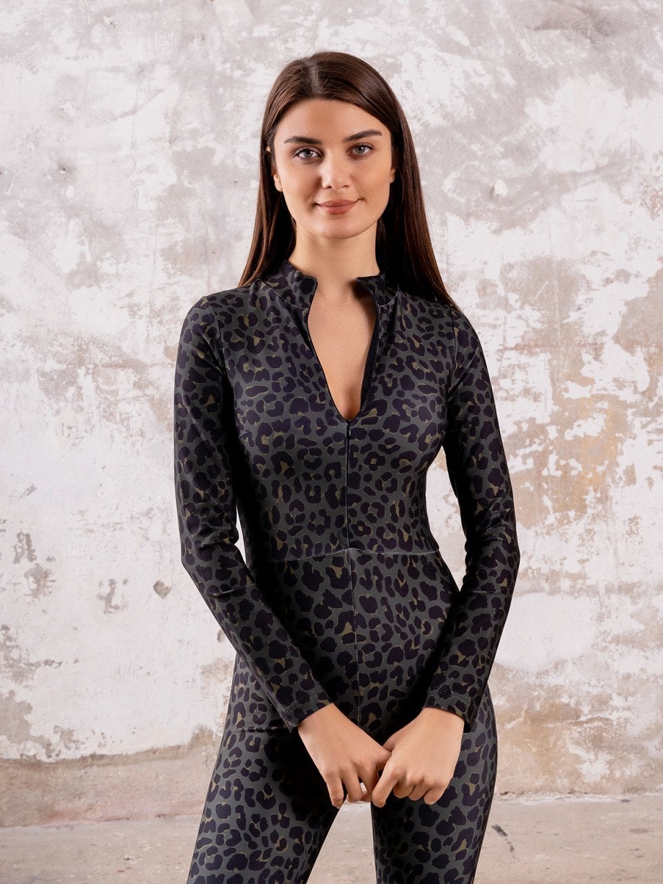 2318 Leopar Desen Uzun Kollu Spor Tulum