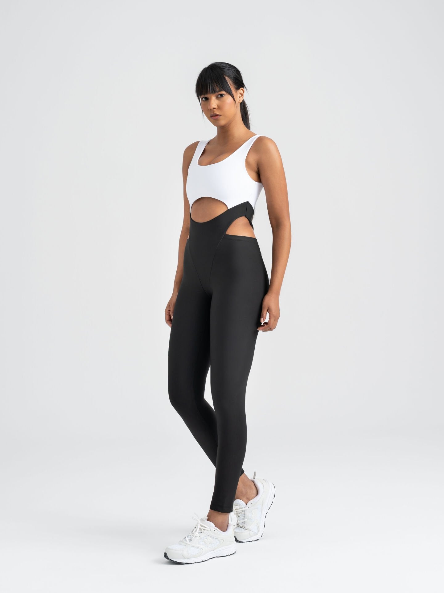 Vurgular: kavisli cut-out bel detayı • vücuda yakın akıcı kesim • yüksek bel hattı • opak, dört yönlü esneme • kaymayan bel bandı • tam boy paça