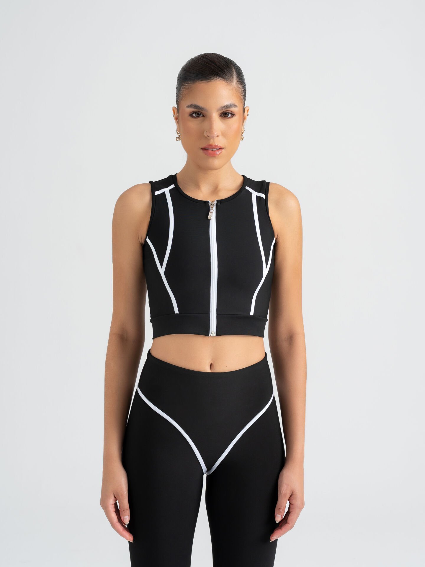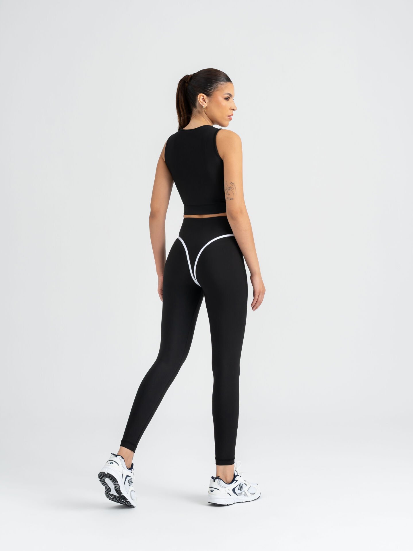 Ön ve arkadan geçen beyaz şerit hatları, vücuda sculpt effect kazandırır