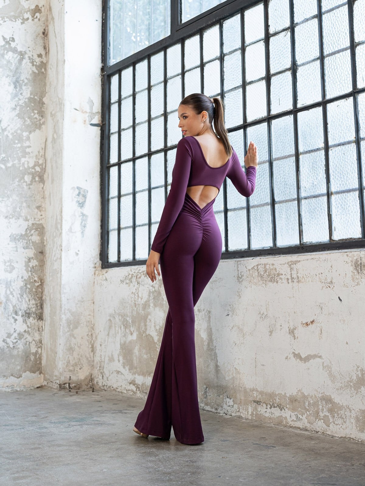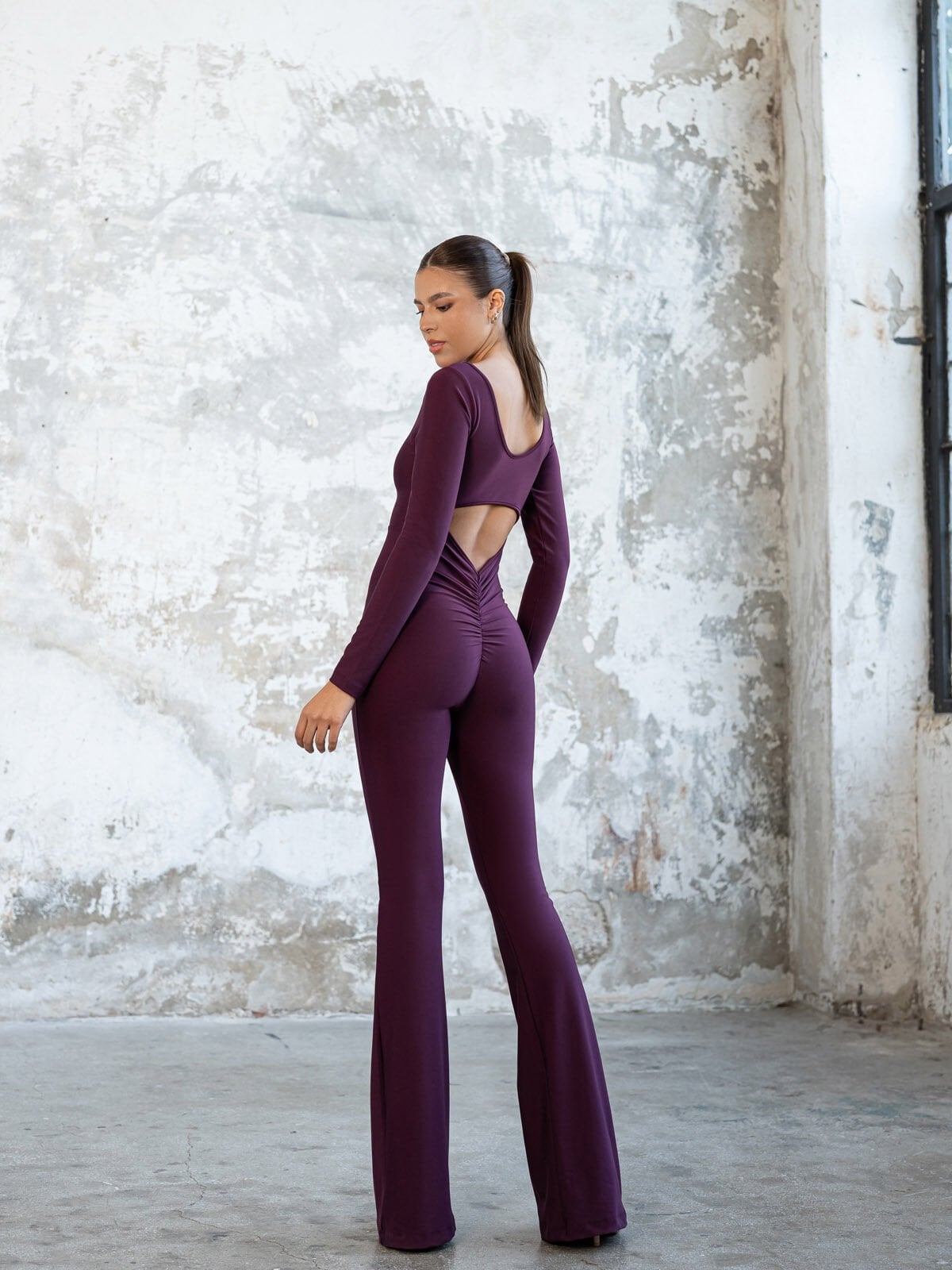 İspanyol Uzun Kollu Scrunch Butt Tulum Mürdüm Renk 3102