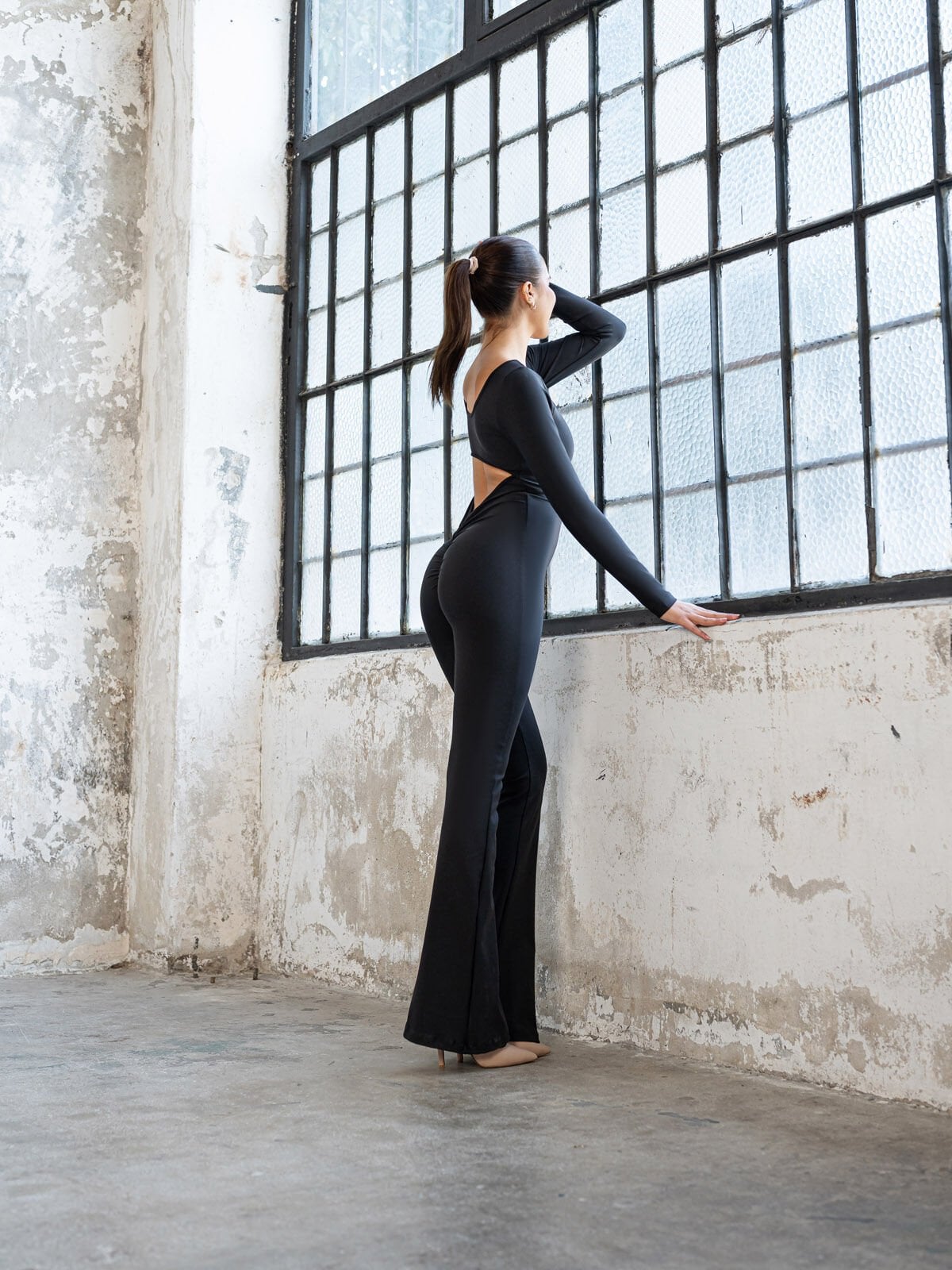 İspanyol Uzun Kollu Scrunch Butt Tulum Siyah Renk 3100