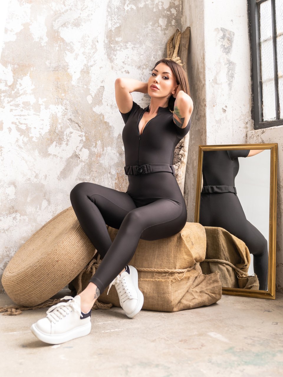 Kemerli Kısa Kollu Tulum Siyah Renk 2337