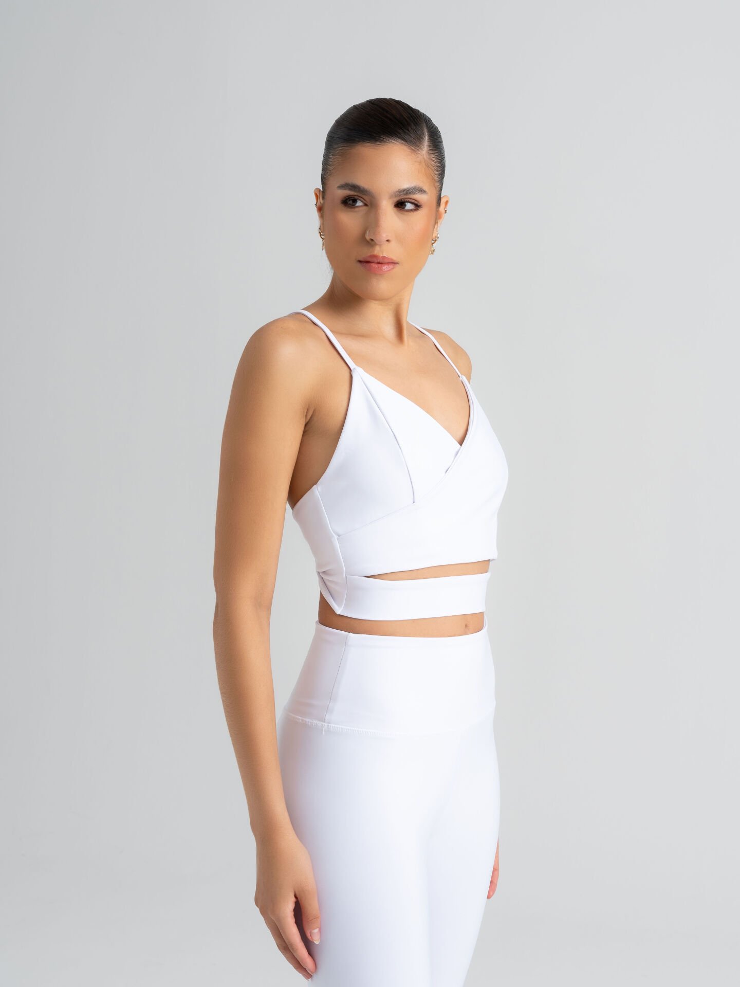 Minimal ve modern tasarımıyla öne çıkan bu beyaz bustiyer, arka kısmındaki düğüm detayıyla zarif bir şıklık sunar. İnce askıları ve üçgen formu sayesinde hem spor hem de günlük kombinlerde rahatlıkla kullanılabilir. Esnek kumaşı vücuda uyum sağlar, gün boyu konfor ve ikinci-ten hissi verir.