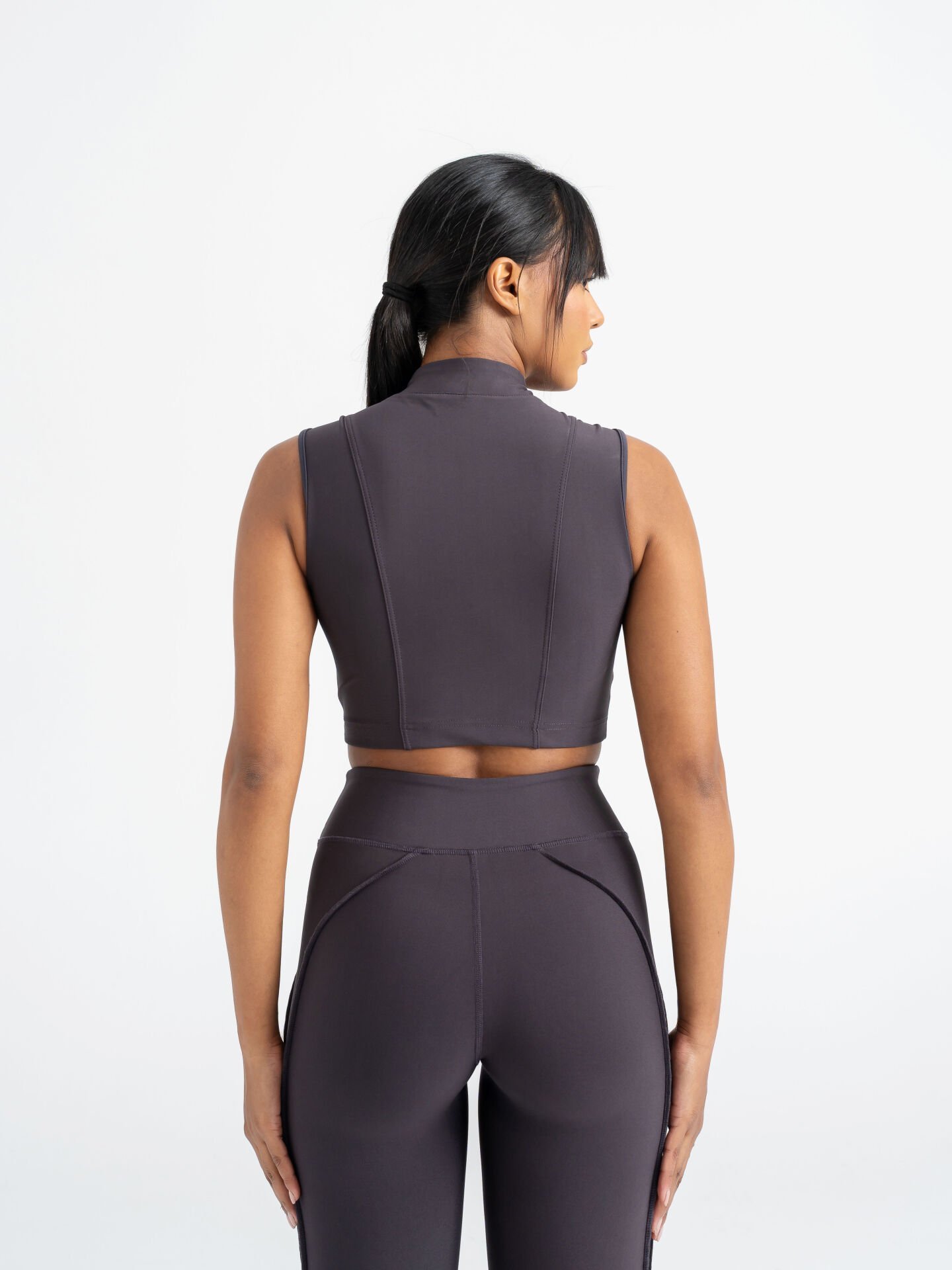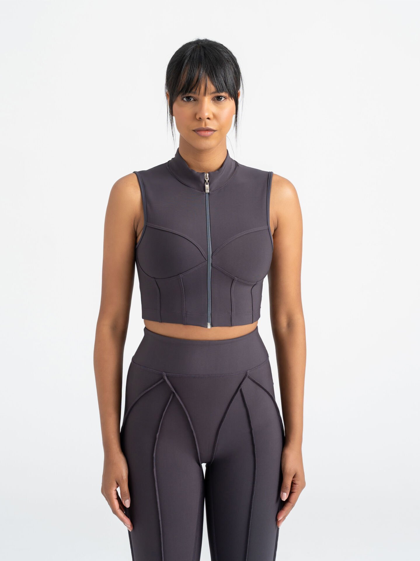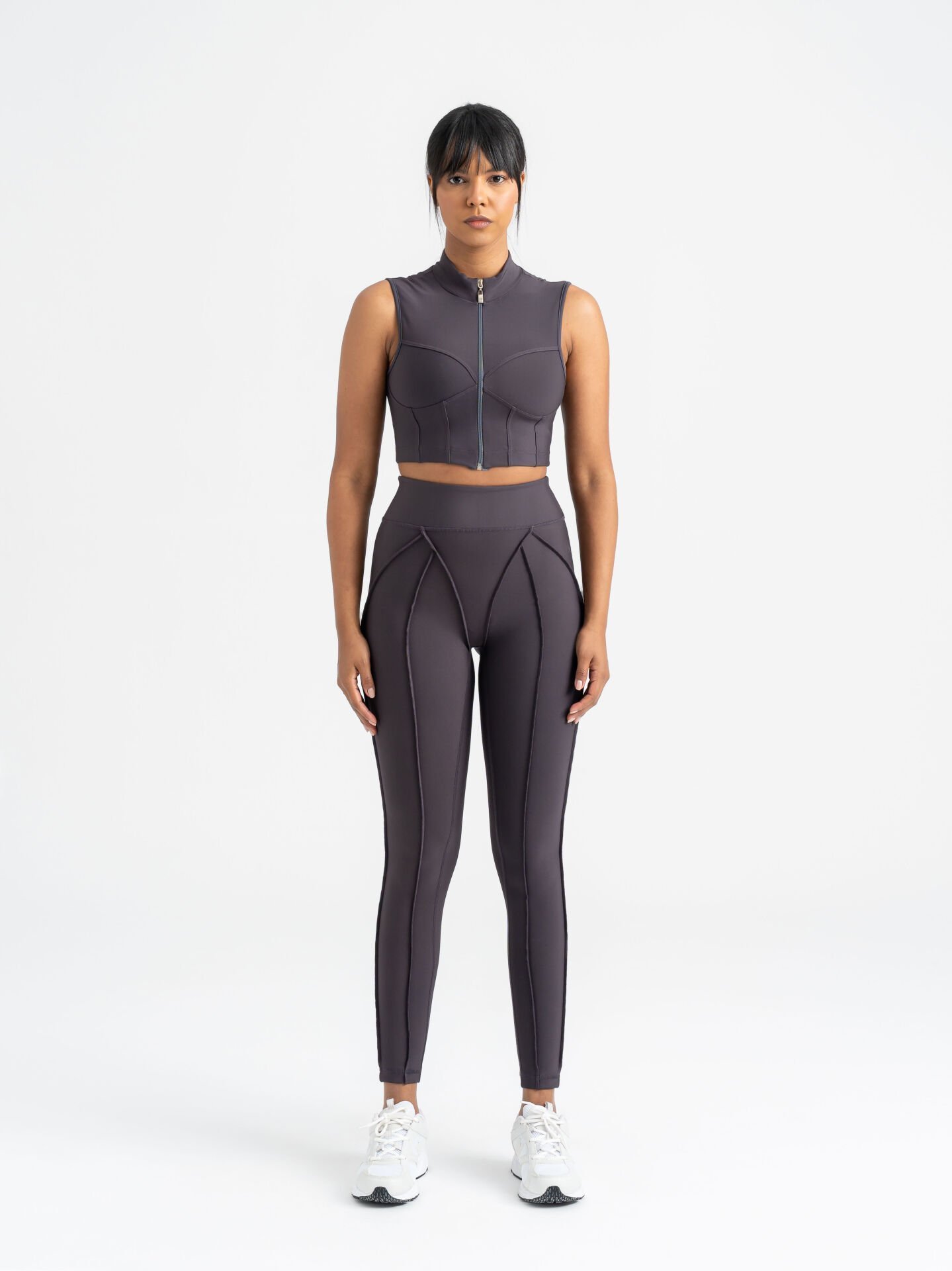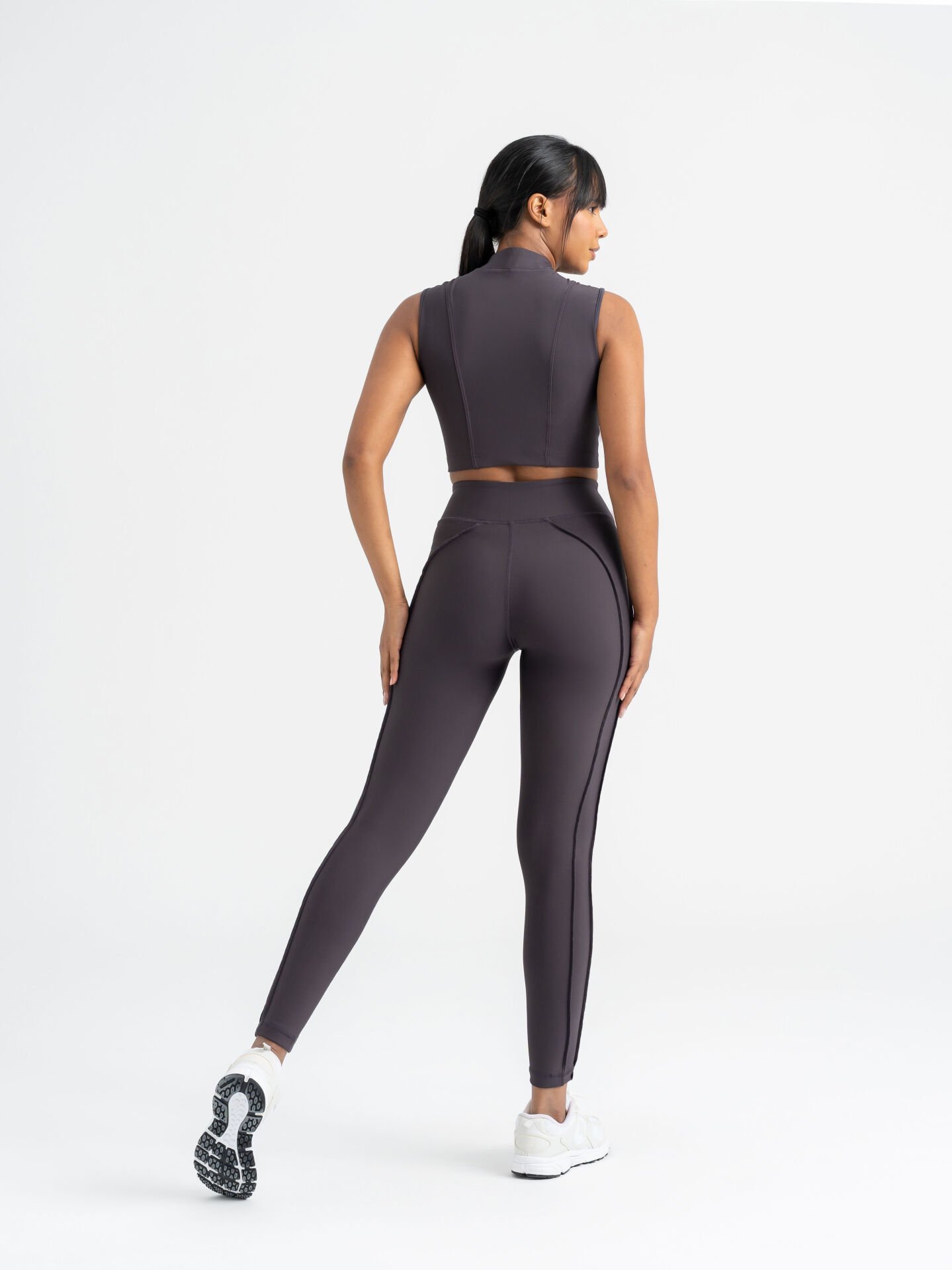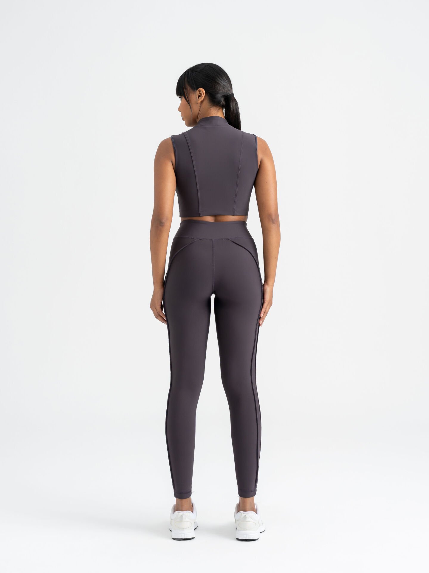 Vücudu şekillendiren dikiş hatlarıyla öne çıkan bu füme (antrasit) tayt, sportif şıklığı ve konforu bir araya getirir.