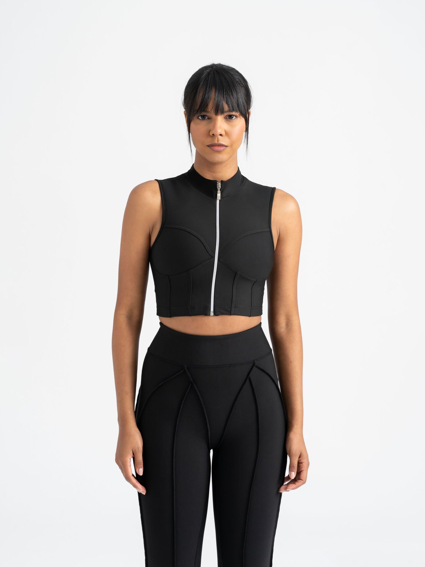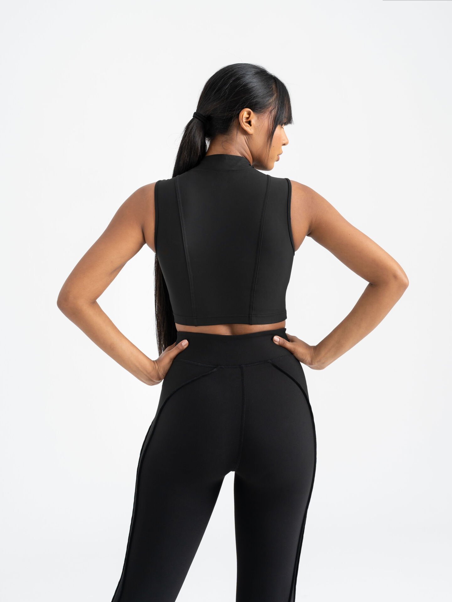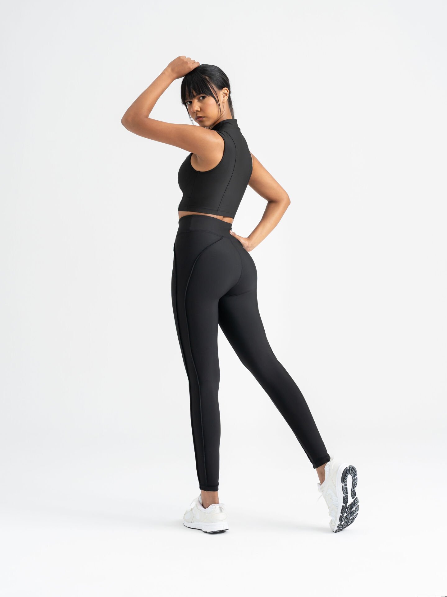 Vücudu şekillendiren dikiş hatlarıyla öne çıkan bu siyah tayt, sportif şıklığı ve konforu bir araya getirir.