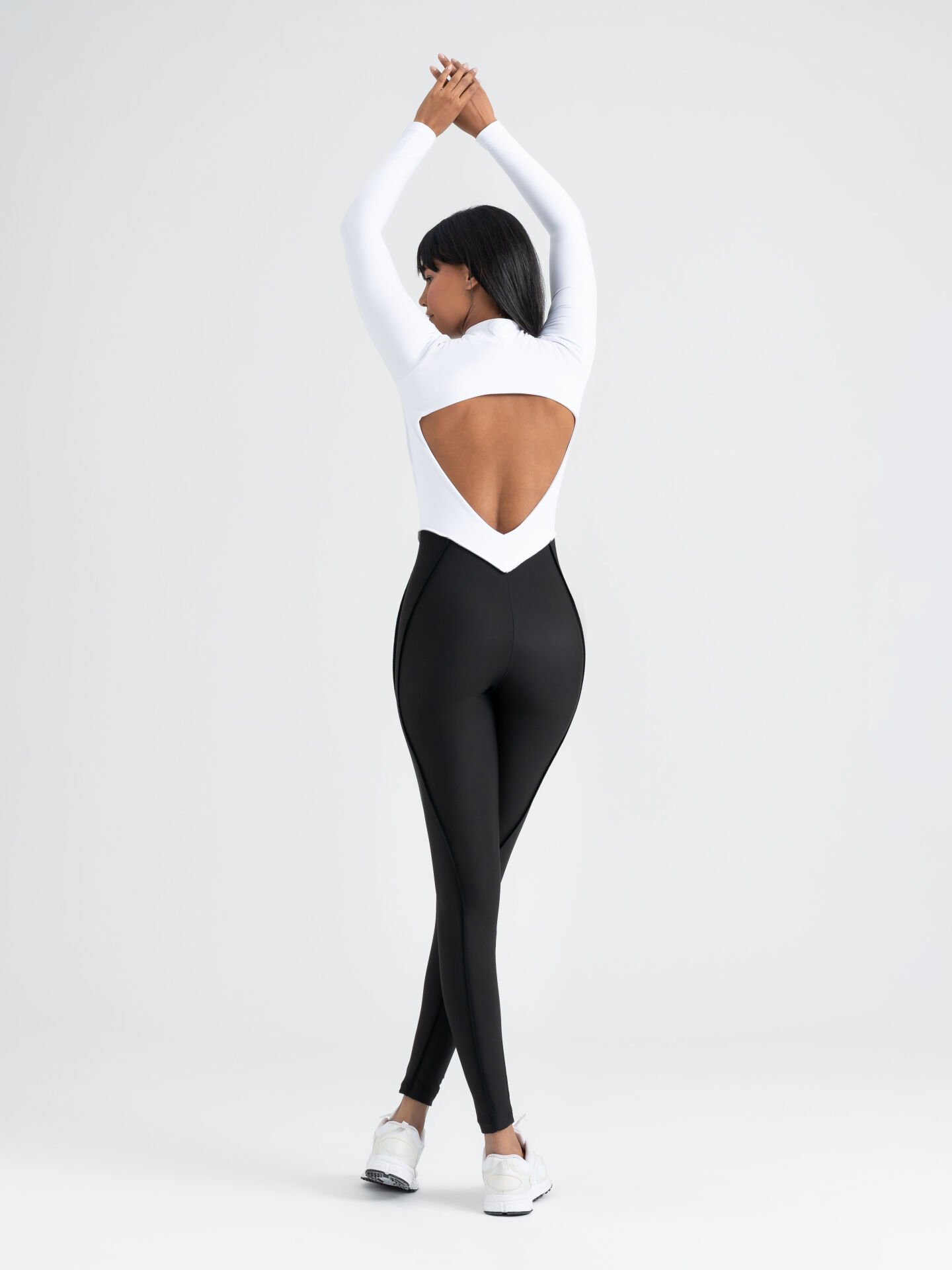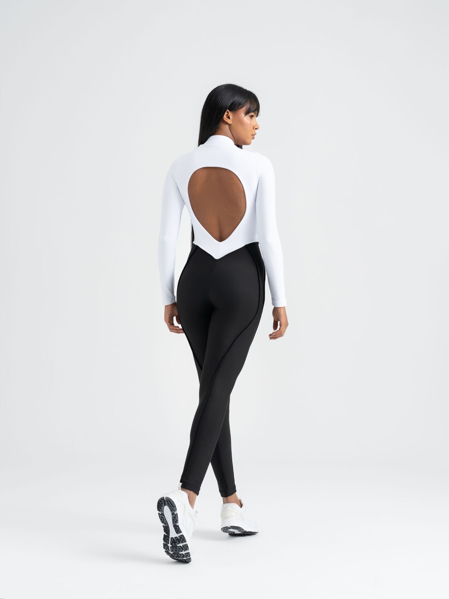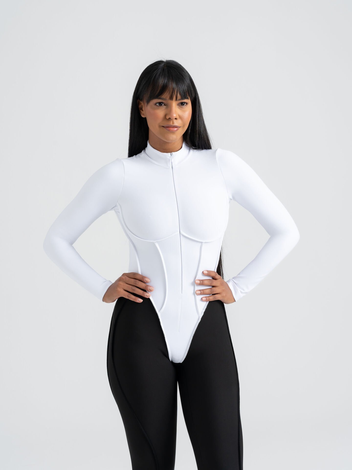Beyaz üst ve siyah altın güçlü kontrastını bir araya getiren bu özel tasarım, vücudu sıkı bir şekilde sararak hatları belirginleştirir.